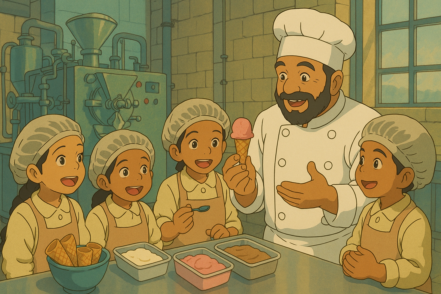 Imagine stepping into a bright and cheerful workshop where the air hums with the sweet scent of real fruits, rich chocolate, and creamy vanilla. Little ones can peek behind the scenes (from a safe distance, of course!) and watch our "Flavor Alchemists" meticulously transforming the finest natural ingredients into our famous Dach & Nona ice creams and desserts. They'll marvel as strawberries become vibrant purees and see how simple, wholesome components combine to create extraordinary treats, all without any artificial anything!